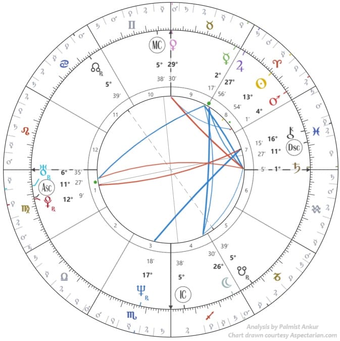 The powerful Pluto position in this chart and overall the Pluto-Saturn opposition across angular houses themselves point to a person who would love to taste power and eradicate the old to start something new. Note the strong 8th house, often found in the charts of successful wheeler-dealers. (Talking of British politicians, former PM Tony Blair was another such wheeler-dealer politician, whose Midheaven lay in the 8th house, and the ruler of that MC/8th house was in exaltation.)