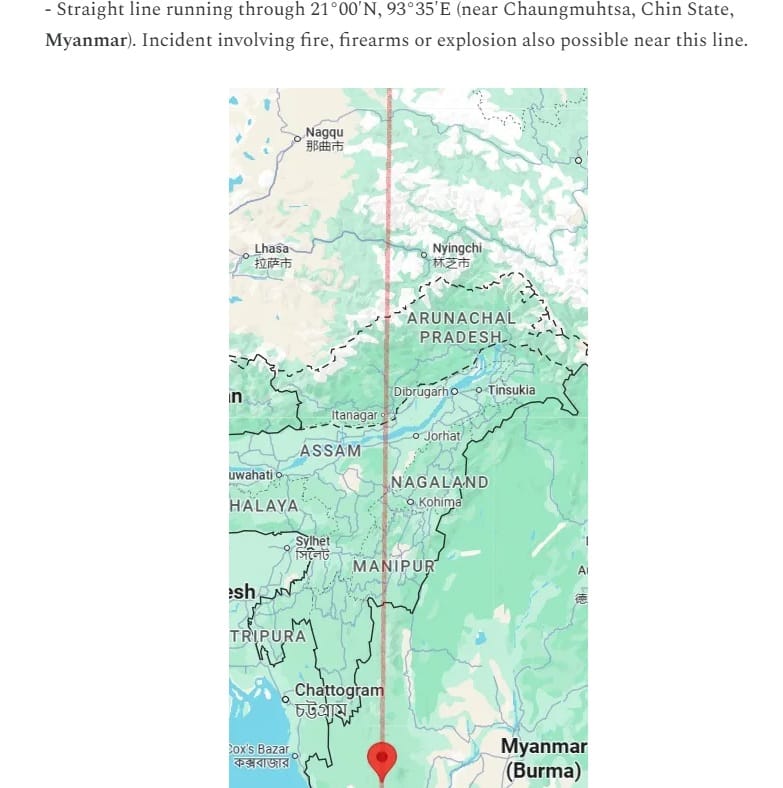 "[Earthquake near] Straight line running through 21°00′N, 93°35′E (near Chaungmuhtsa, Chin State, Myanmar). Incident involving fire, firearms or explosion also possible near this line."