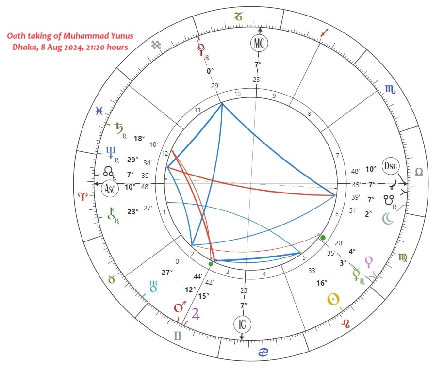 The ruler of 1st (Yunus's government) and 8th (that government's longevity), Mars, is in a close conjunction with Jupiter and a square with an out-of-sect Saturn. Mars will first meet Jupiter, then Saturn. The ruler of 10th (the government's power and authority) and 11th (allies of the ruler), Saturn, is in the 12th. Mars does apply to Saturn, so Yunus will hold power. However, it seems that his power as well as the support of his allies are in danger from some kind of backstabbing or conspiracy.