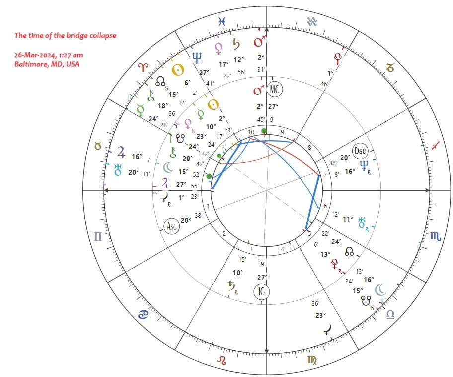 Whoever inaugurated this bridge at such a moment certainly did not know of any astrology! What a terrible time to inaugurate something like a bridge. The very Ascendant is in a common sign, whereas for a highly durable thing which a bridge ought to be, a fixed sign would be much better. The ruler of the house of death (the 8th), and also the ruler of the Midheaven, is a retrograde Saturn in the sign of its detriment plus in the wrong hemisphere, given that it is the in-sect malefic here, indicating low chances of a long life. Instead, Mars, the out-of-sect malefic, is very angular and in 10th, whose ruler, Jupiter, is in 12th, the house of losses. And to come back to Saturn, it occupies the 3rd house, which is the most important house to judge for a bridge. Mercury, the natural functional ruler for a bridge, is not only combust but in a loose-orbed opposition with Pluto and in a very tight trine to the aforementioned, undignified Saturn. Pluto is at the almost exact midpoint of the Sun (vitality) and the South Node/Ketu (dissolution), and by its aspect to Mercury, transferring this tension to Mercury. A retrograde Venus in the sign of its detriment is in conjunction with this same South Node. Let us not forget to look at the Moon, the very body of the bridge: it is exalted in Taurus, but that's not a great thing when one looks at its loose-orbed opposition to Uranus. Being in domicile gives more stability, especially to a naturally fickle planet such as Moon, rather than being exalted, and for a bridge all we want is stability and durability. Exaltation by itself would have been OK, but here it is being aspected by Uranus, the sudden shock and blows giver.