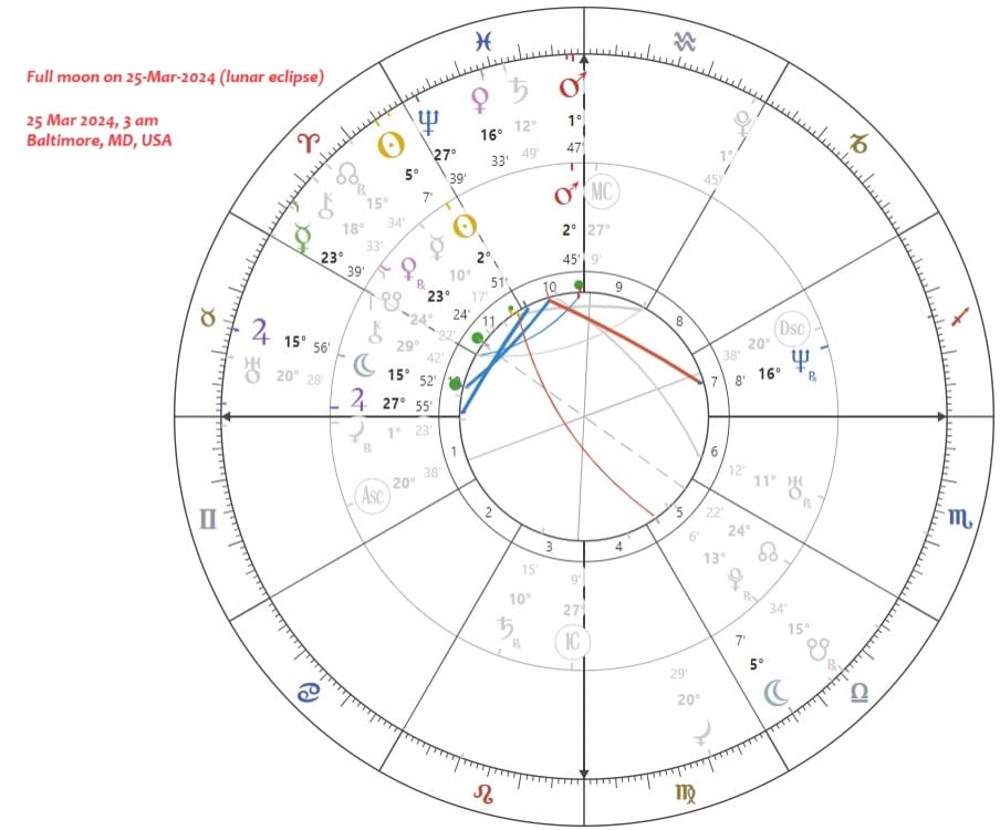 Let us look at the March 25 lunar eclipse chart, overlaid on the bridge chart. I am doing it not for the time at which eclipse starts or reaches a maximum, but at the time the full moon perfects. To look at moon phases even for eclipses is my usual practice.