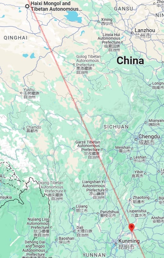 You can see the line passing through the Garzê Tibetan Autonomous Prefecture, and this Badi Town is very close to the line. (Ignore the coordinate symbol here.) The line also passes close through the Qinghai-Gansu border area. It is no wonder this whole area is receiving very heavy rainfall, and there was at least one landslide near this line.