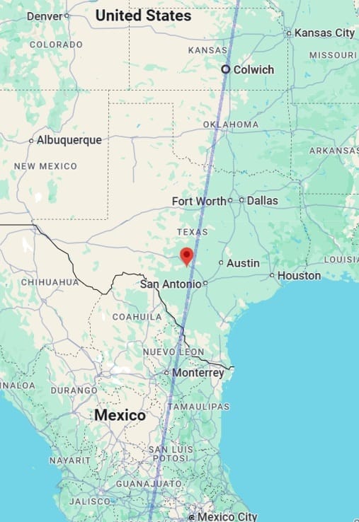Let us look at the tragic incidents in Texas (USA) finally. The summer camp incident, with several girls being swept away bu Guadelupe River in Hunt (Texas), has happened almost exactly on a prediction line in that post. Here is the line again: the blue line in the following picture is the prediction line I had posted earlier, and the red symbol shows the spot of the tragic campsite.