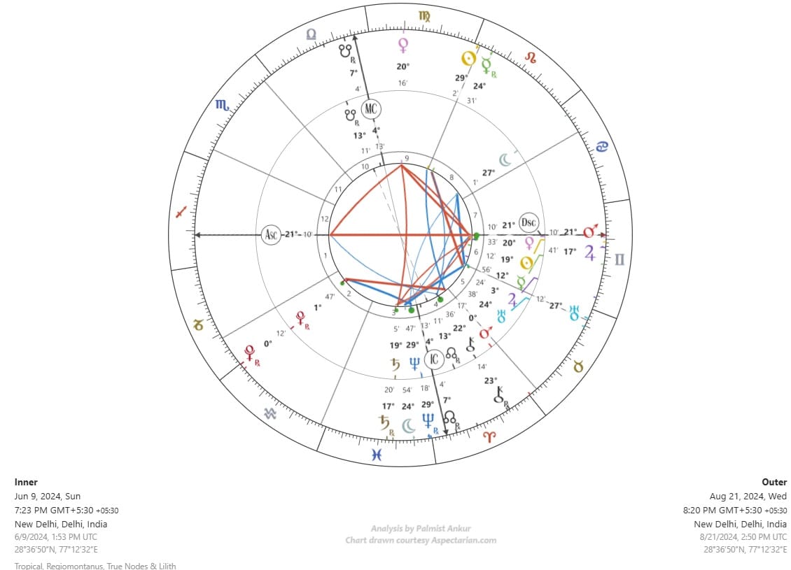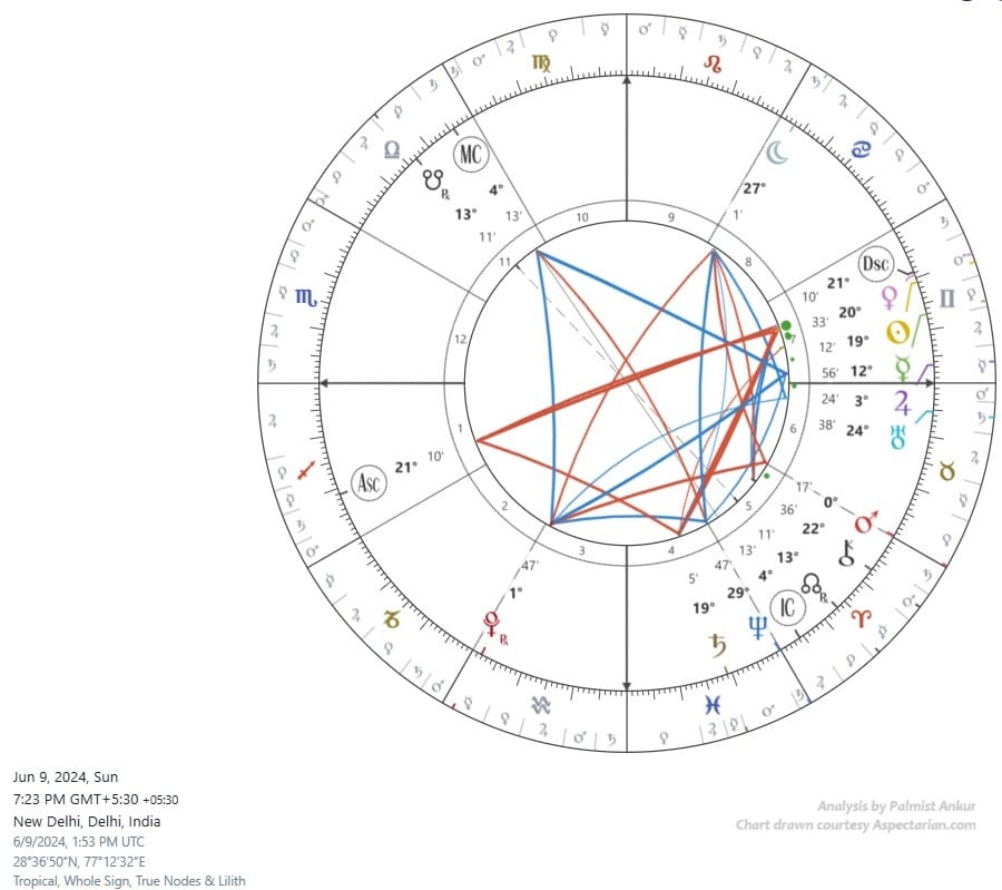 Let me end with going back to the Pahalgam attack and Modi's swearing-in chart. When I first analysed the swearing-in chart on June 9, I made the mistake of counting time by Moon, which is often done in charts to see the course of action. Thus, I predicted how the government may find itself with changed circumstances in 3 months and in danger of fall in less than 5 months. I was wrong, I was relying on a false indicator. It is Saturn that dominates that chart. So let us look at Modi's swearing-in chart yet again (so you don't have to scroll all the way up, here it is again):