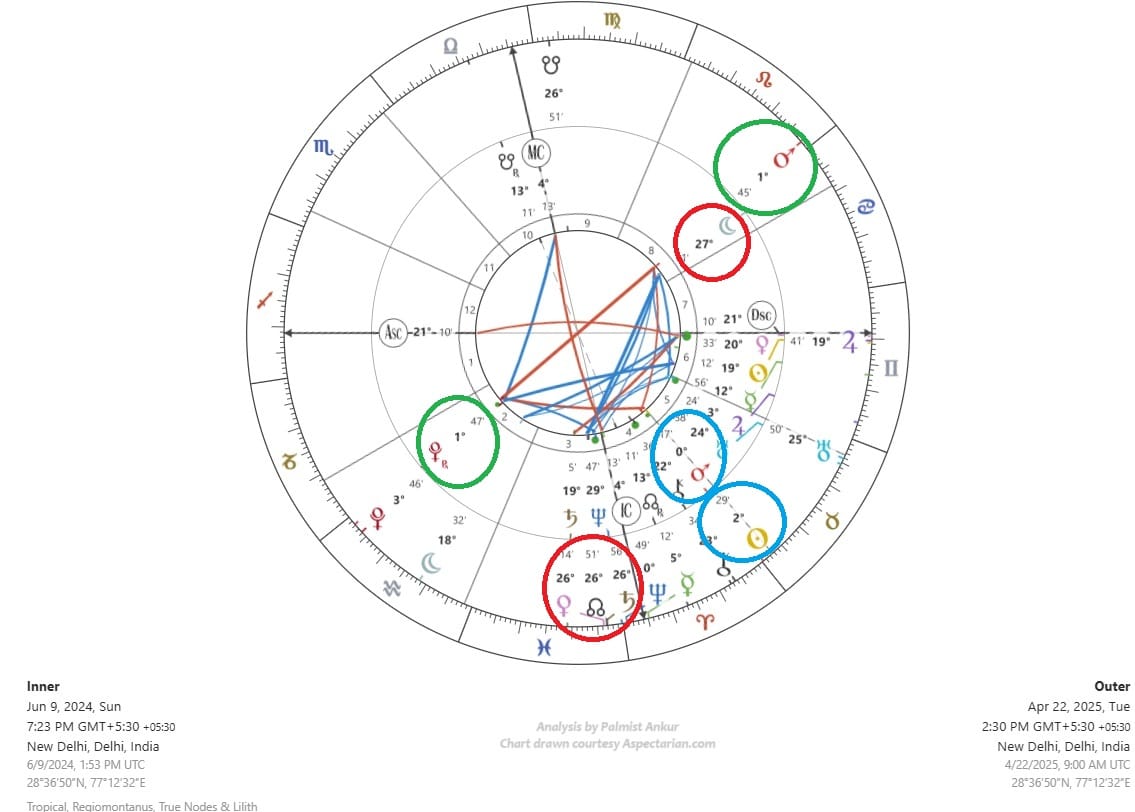 (1) Look at the malefic Mars! When Modi was sworn in, Pluto was at 1 degree 47 arcminutes in the sign of Aquarius. At 2:30 pm on April 22, 2025, around which time the terrorist attack happened in Pahalgam, Mars (aggression) was exactly opposite that swearing-in chart's Pluto (ruling enemies and revenge in this chart), at 1 degree 45 arcminutes in Leo. (These are shown in green circles above.) In fact, the Pahalgam Mars is also squaring the swearing-in chart's Mars, and transit Sun, at 2 degree 29 arcminutes in the sign of Taurus, is illuminating this whole setup. (These are shown in blue circles above.)