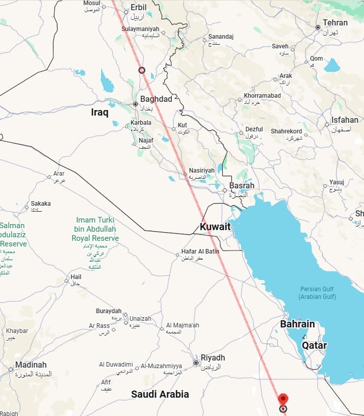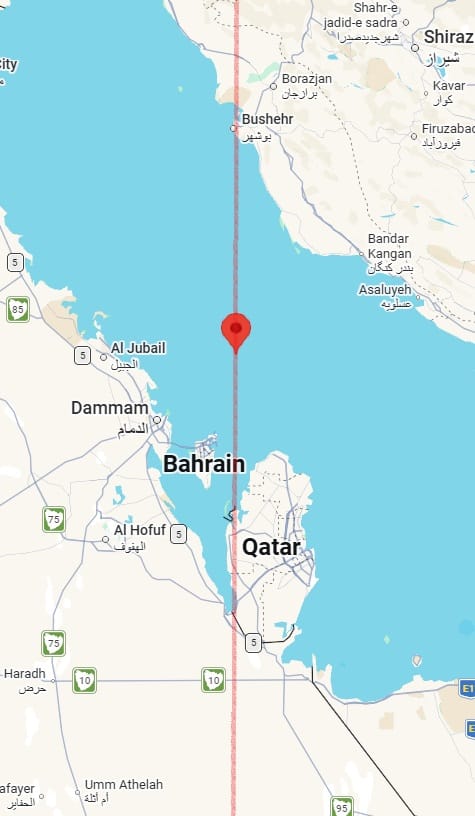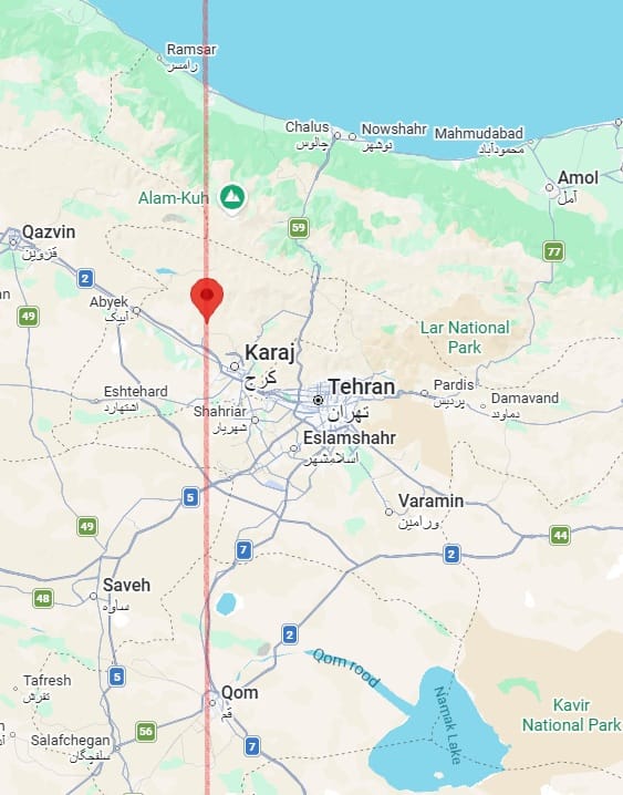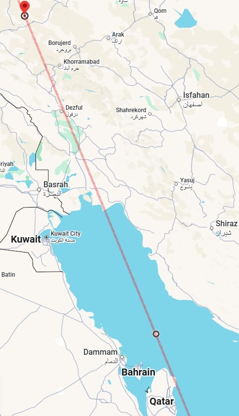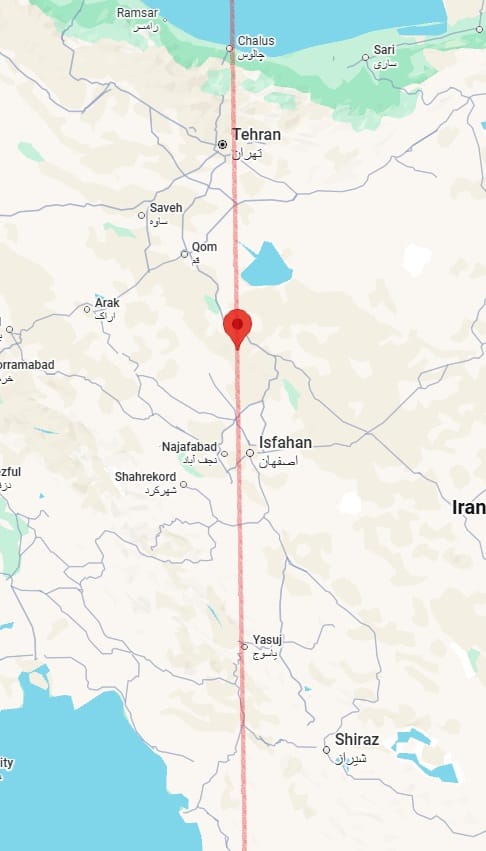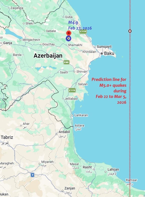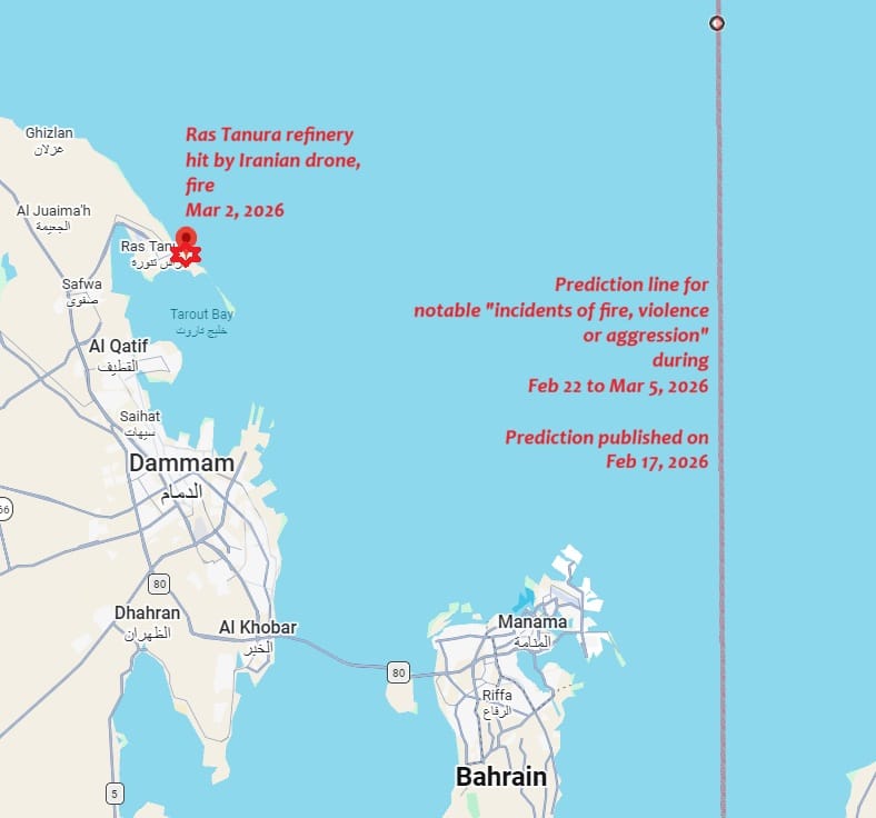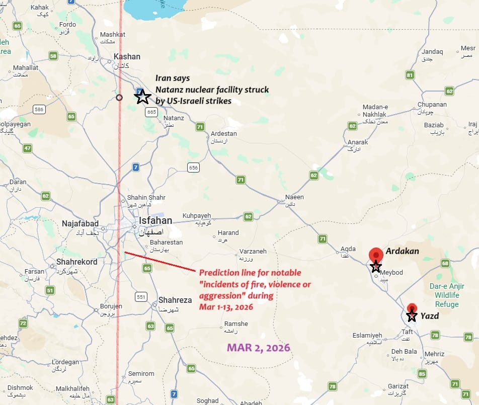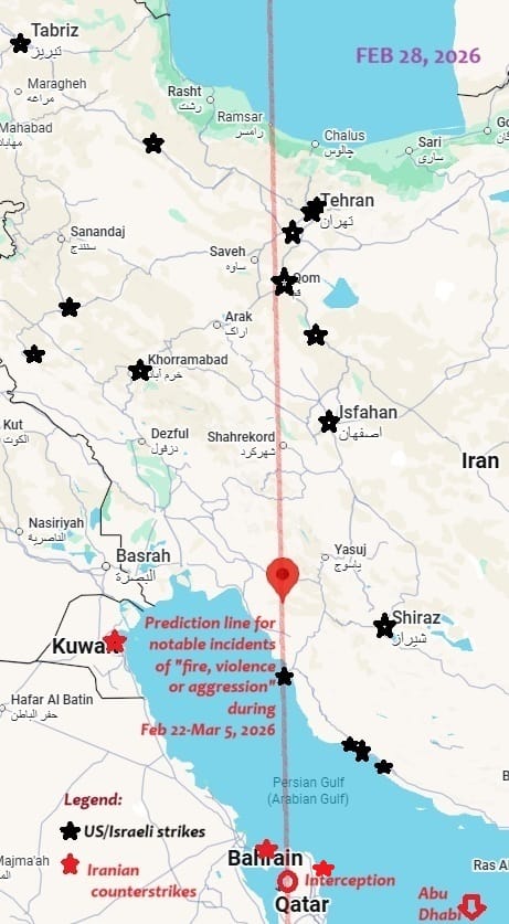 Thus, for example, on 17 February, I posted one prediction line, saying: "Straight line running through 27°00′N, 50°51′E (a point in the Persian Gulf). Noteworthy accidents of incidents of fire, violence or aggression or strong storms could also occur [besides M5.0+ earthquakes] near some sections of this line. When extended north, the line will pass close to several major bases of the Iranian executive, military and theocracy, such as Tehran, Qom, Karaj, Kashan and Qazvin."