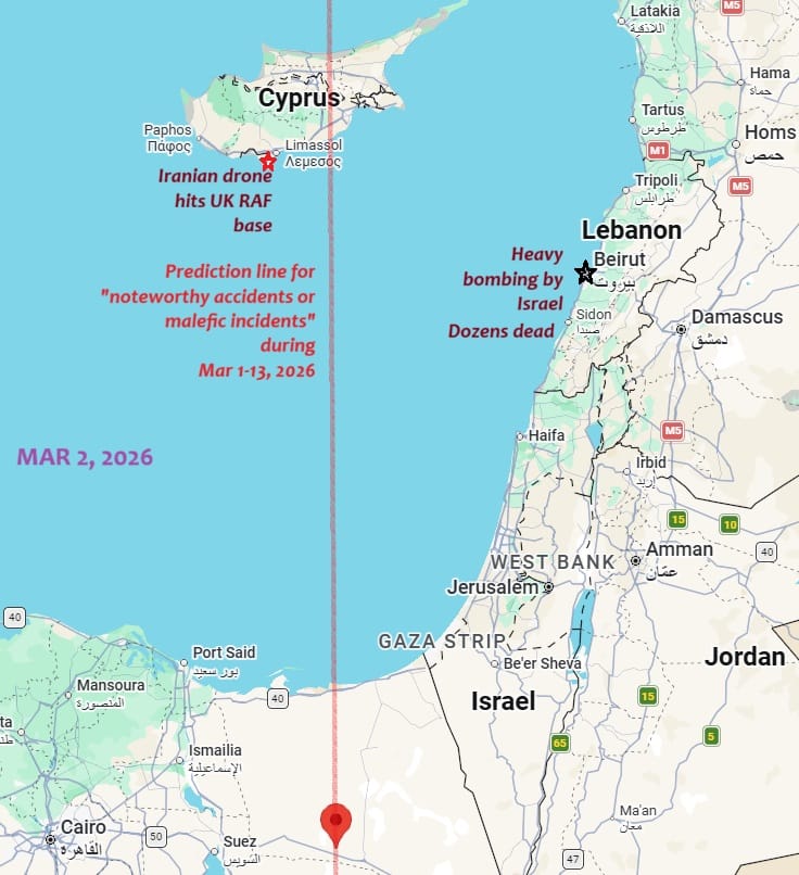 Prediction lines for earthquakes and/or different types of malefic incidents: for description of the type of malefic incident expected near a line, go to astroweatherwatch.substack.com