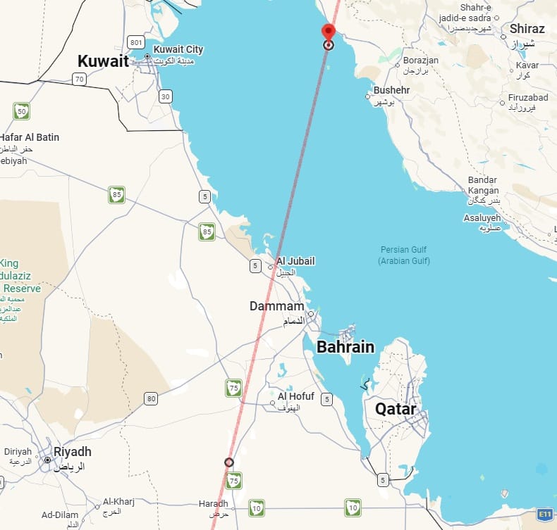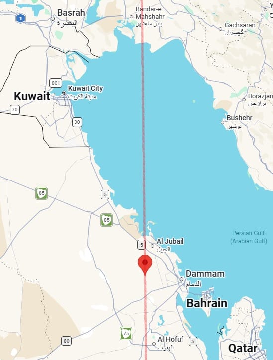The line crosses the Persian Gulf, before crossing into Saudi Arabia near Dammam, passing close by Bahrain.