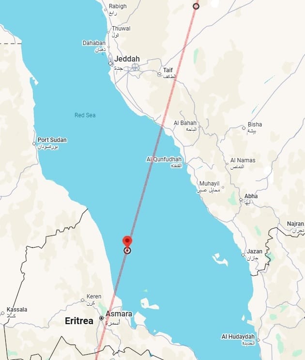 The Makkah Province-Red Sea section of the line appears strongly malefic, and one wonders if the war is going to expand to Jeddah-Red Sea area. So far, as of the time of writing this, the war has not expanded to the Makkah-Red Sea area. This reminds one of the Houthis: this period could see the Houthis becoming active or being attacked by the Israelis.