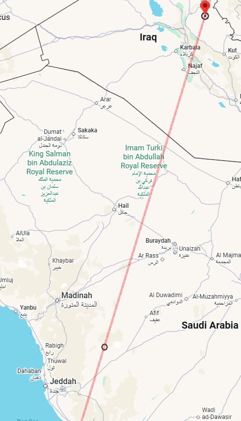 - Line between 33°42′N, 45°07′E (northeast of Baghdad, Iraq) and 22°53′N, 41°22′E (north of Umm Aldoom, Makkah Province, Saudi Arabia).