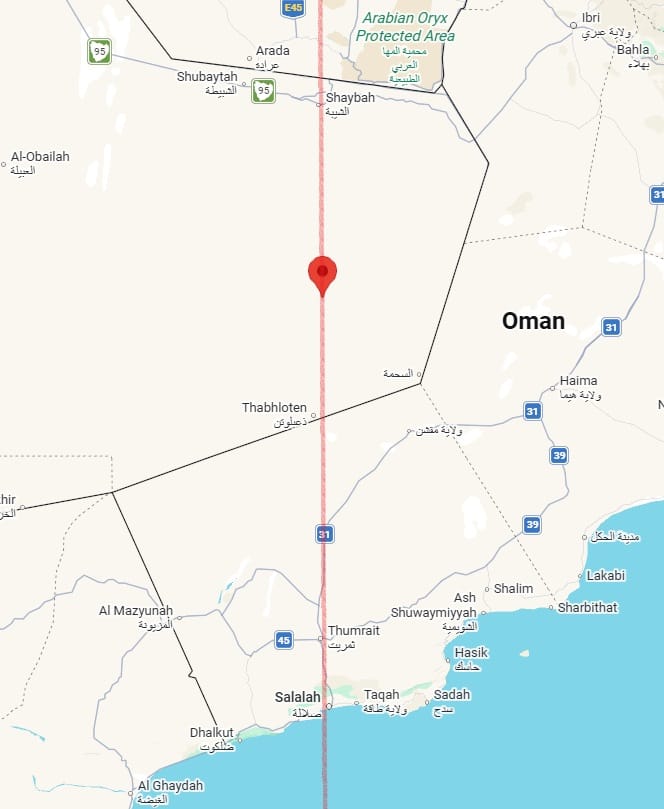 When extended south, the line will go right through the Shaybah oil field of Saudi Arabia and the port of Salalah in Oman: