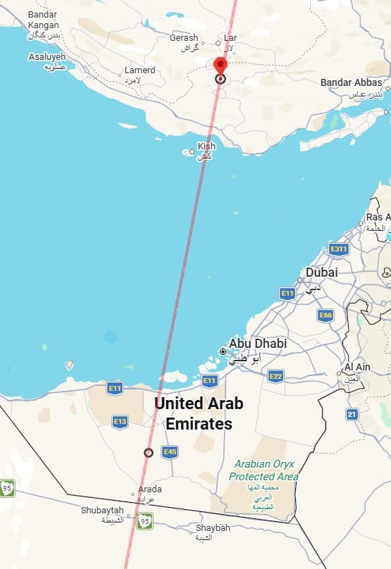 - Line between 27°18′N, 54°21′E (near Fatuyeh, Hormozgan, Iran) and 23°23′N, 53°31′E (north of Arada, Abu Dhabi, UAE).