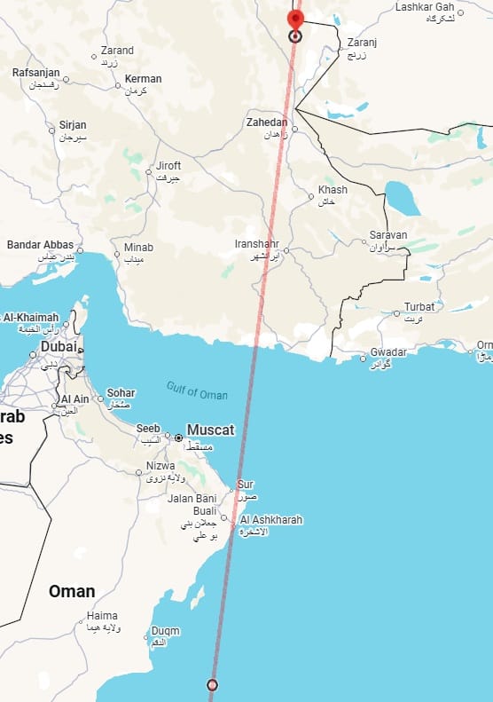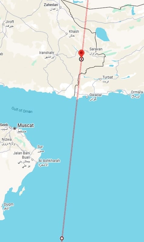 - Line between 31°11′N, 60°53′E (near Zabol, Sistan and Baluchestan, Iran) and 18°41′N, 59°06′E (southeast off Duqm, Al Wusta Governorate, Oman).