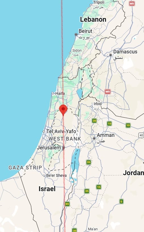 All of Israel, Palestine and Lebanon as well as Irbid in northern Jordan and the Jordanian capital Amman lie well close to this line.