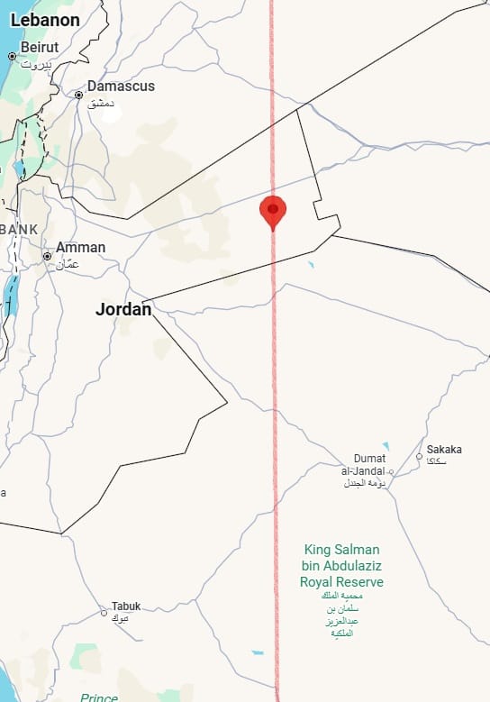 - Straight line running through 32°12′N, 38°31′E (southeast of Ruwaished, Mafraq Governorate, Jordan).