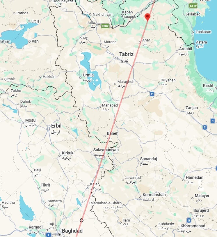When extended north to 39°00′N, 47°19′E (near Homu, East Azerbaijan, Iran), the line can be seen thus, but the Urmia-Tabriz area (Iran) does not appear as much malefic; however, this line, too, passes through Kurdish areas, till where the malefic nature extends: