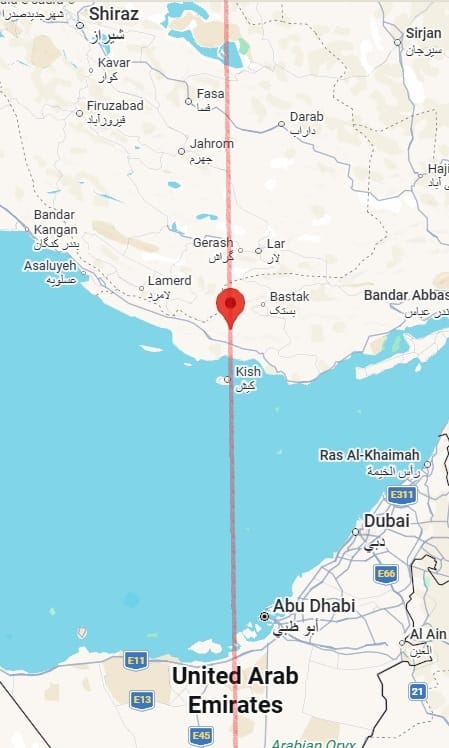 - Line between 34°00′N, 51°39′E (near Fakhreh, Isfahan, Iran) and 30°30′N, 50°37′E (near Paduk, Kohgiluyeh and Boyer-Ahmad, Iran).
