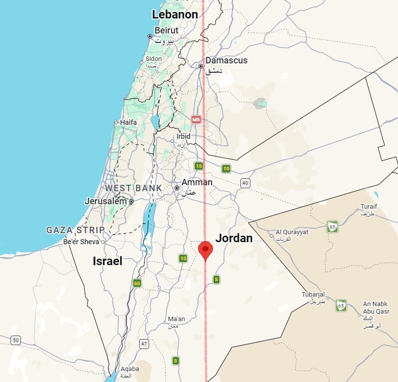 - Straight line running through 31°00′N, 36°21′E (northeast of Al-Jafr, Ma'an Governorate, Jordan). All of Iraq and Lebanon are comfortably within the prediction range of this line, and strong airstrikes and high violence are strongly likely in this prediction section.