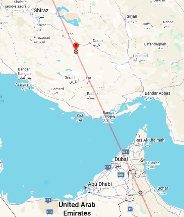 - Line between 28°30′N, 54°04′E (east of Jahrom, Fars, Iran) and 24°18′N, 56°13′E (northeast of Humaydah, Al Buraimi Governorate, Oman). Strong number of casualties are likely near this line, which, passes by much of the UAE, including key hub Dubai, and when extended north, will pass right through Isfahan, Qom and Qazvin in Iran and passing close by capital Tehran and Shiraz.