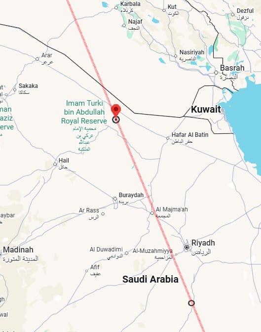 - Line between 29°00′N, 44°01′E (northeast of Linah, Northern Borders Province, Saudi Arabia) and 22°48′N, 46°51′E (south of Saudi capital Riyadh). Iraqi capital Baghdad and much of Kuwait are within the prediction range of this line, as is, if one extends north, western Iraq (near the border with Jordan). I have shown what appears to the most mischief-prone area: