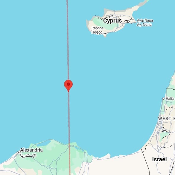 - Straight line running through 33°00′N, 31°41′E (southwest off Paphos, Cyprus). This is a line near which strong airstrikes, fires and explosions can happen. Several key Israeli hubs such as Tel Aviv, the Port of Haifa, and Beersheba lie within the prediction range of this line.