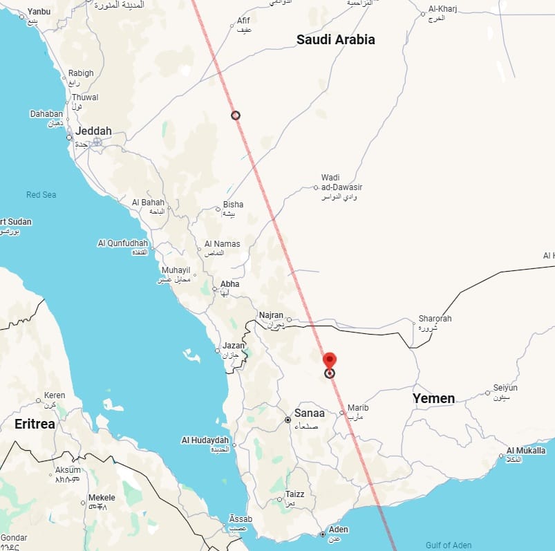 - Line between 22°00′N, 43°00′E (north of Ranyah, Makkah Province, Saudi Arabia) and 16°23′N, 45°10′E (northeast of Al Hazm, Al Jawf Governorate, Yemen). The Houthi-controlled Al Hudaydah and the Bab-el-Mandeb (the strait that connects the Red Sea to thee Gulf of Aden) are well within the prediction range of the line, thus strikes by the Houthis, or strikes targeting the Houthis, could be anticipated. This section does not appear very highly malefic, though.