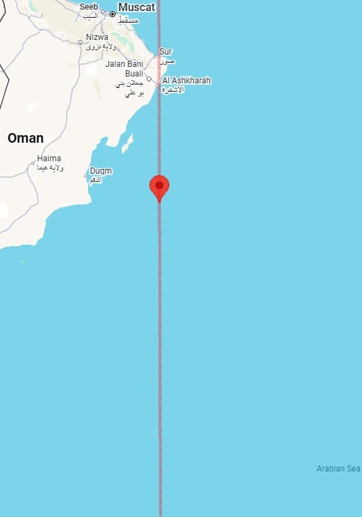 - Straight line running through 19°00′N, 59°37′E (east off Ras Madrakah, Al Wusta Governorate, Oman). When extended north, the line will pass through the Zahedan-Iranshahr area of eastern Iran, and while incidents and attacks may of course happen there as well, I am showing the eastern Oman-Arabian Sea area, because this is the area that strongly shows mischief.