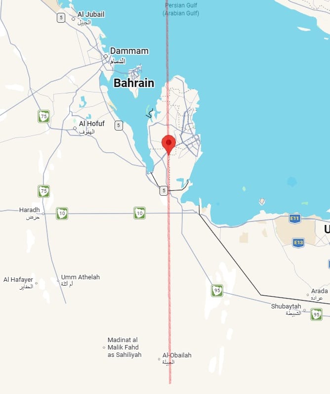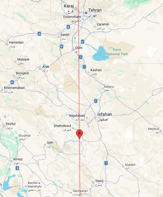 - Straight line running through 32°00′N, 51°06′E (southeast of Shahrekord, Chaharmahal and Bakhtiari, Iran). The line passes near key Iranian hubs, such as Karaj, capital Tehran, Qom, Kashan and Isfahan, and passes very close to the Natanz nuclear facility.
