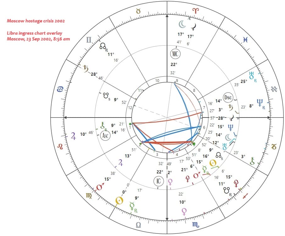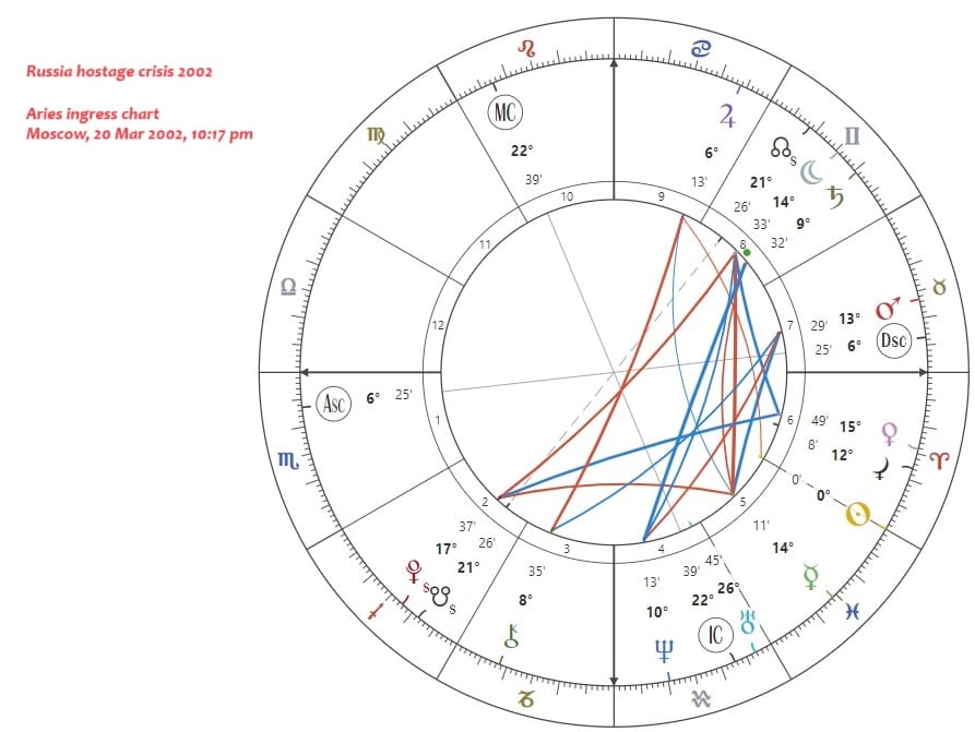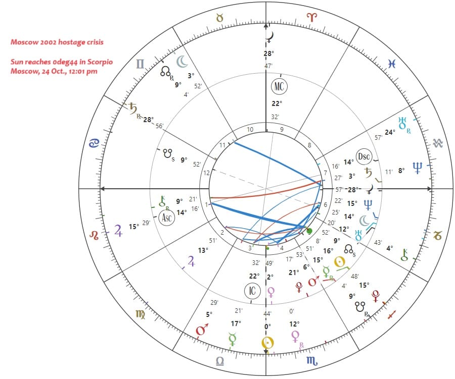 At midday of 24th of October, it reaches exactly at that point. In the afternoon of 22nd of October, Mercury had already reached the contra-antiscion of Mars, at 14 degrees 22 minutes in the sign of Libra. Thus, the dates from 22nd of October morning till 24th of October night could be considered critical: the attack happened on the evening of 23 October, and the crisis finished on 26 October, with all 40 terrorists and 132 hostages dead. Most died because of the use of a poison gas by the Russian special forces: note that the house of death, the 8th house, in the Aries ingress chart is the sign of Gemini, an air sign. Note also the presence of the North Node, the amplifier Rahu, in the 8th house there. Did it signify the amplification of the number of dead? Or the number of death operators (the terrorists)? Or both?