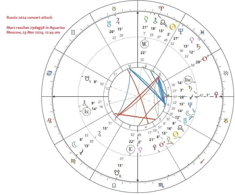 The attack happened in a concert hall (Mars in 5th house in ingress chart) and was claimed by Islamists. Russia has a long history now of fight with Islamists and those republics which want independence from the Russian federation (Chiron placement and aspects, and Sun entering 6th house in ingress chart). The fight affects lots of civilians (Moon in tension with Chiron, Moon on midheaven in ingress chart), and several elderly (Saturn in 8th in the ingress chart). Venus is also in 8th at the time of Mars reaching the midpoint place, thus women also may be among the dead, and children (5th house also governs children).