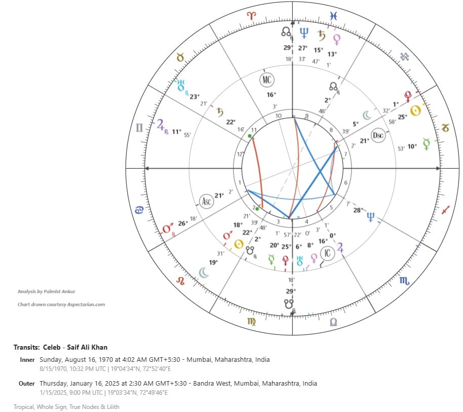 Now let us jump to the present. On January 16, 2025, around 2:30 am at his Bandra (West) apartment, he was stabbed multiple times in a serious attack. What does one see? Neptune is almost exactly arcing to his Ascendant. Neptune stands often for someone dishonest. If you were ever burgled or defrauded or cheated by someone, you will often find Neptune-Mercury in play. Here, Mercury is not involved, as there is no fraud. Just the Neptune is there. And the Ascendant, representing the person's body. Thus, the attack was caused by someone dishonest, or the reason behind it is some kind of deception or dishonesty.