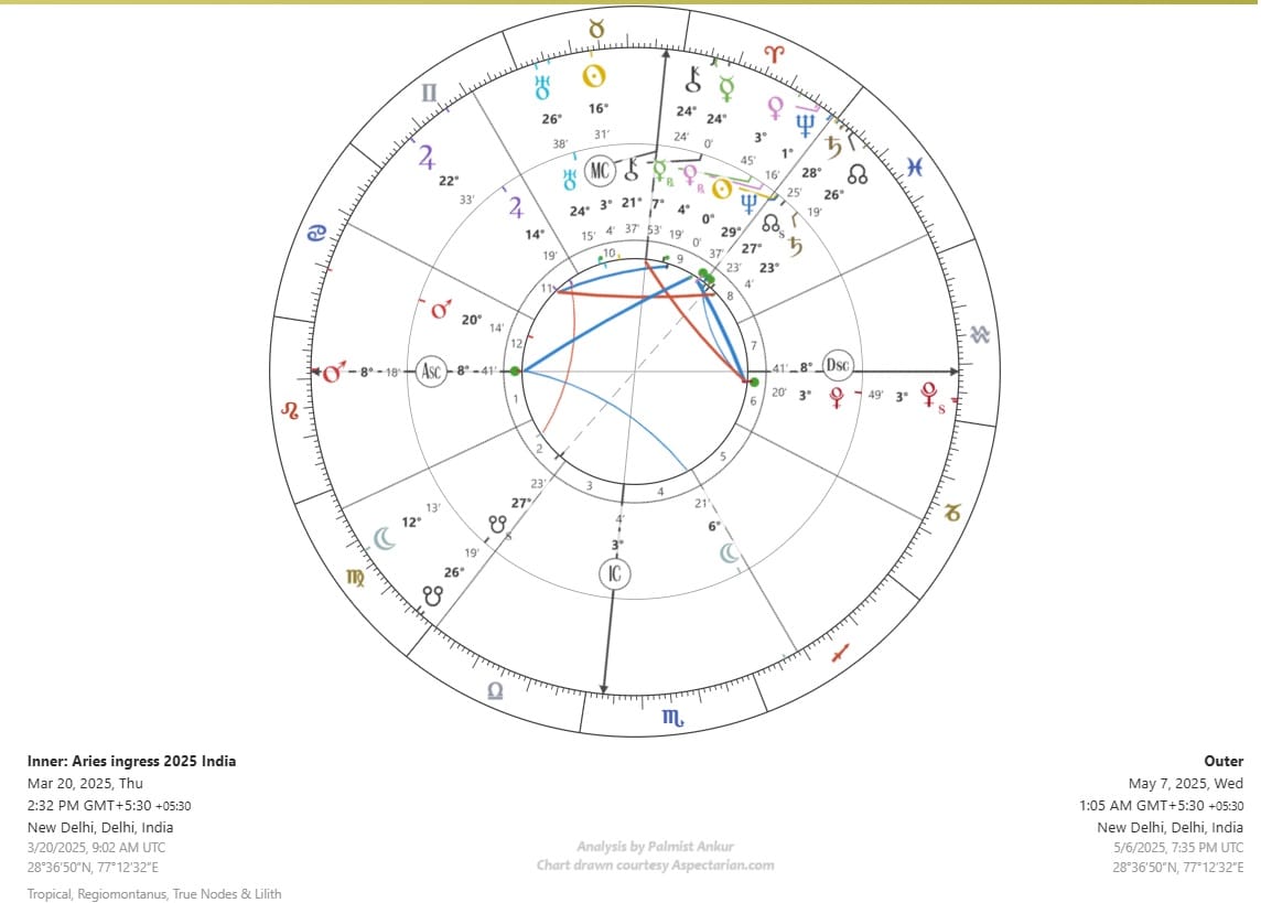 While in recent days I had said May 1-5 as the most probable dates for Indian strike on Pakistan, today I opened my Critical Dates page to check what I had marked for India back in February 2025 (when I publish my predictions for a country, I also update the Critical Dates for that country, and I had published my India predictions for this year on February 10, 2025). I was amazed to find May 7-9 listed among the Critical Dates for India, so I wondered why I would have put those dates there at that time (I forget things, as I look at so many charts in a day), and I decided to open the Aries ingress chart for this year for India. And the astrology is astonishing, mind-boggling!