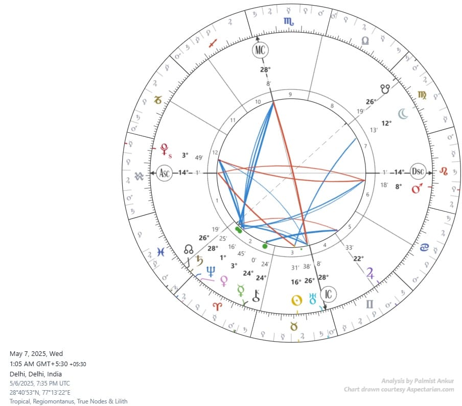 Now let us talk about the future, starting from a bit longer term. Saturn is very late in Pisces, and in 1 degree and 35 arcminutes, it will cross into Aries, a sign where it is in its fall. Thus, astrology suggests that in around 1 and half units of time, things may start going not well for India in this conflict. It is always difficult to estimate from such charts, what unit of time—hours, days, weeks, months, seasons, years?—and astrologers often use context to think of the unit. Pisces is neither a cardinal sign nor a fixed sign, so let us keep away the shorter and longer units, that is, hours and years, away. This leaves us with days, weeks, months, seasons. In around one and half of this unit of time, things could turn bad for India in the conflict. Is it one and half months then, given that I had predicted war possibility from late June 2025 onwards in my Pakistan predictions? The period from late May 2025 to early 2027, as I have said already in several posts, looks difficult for India. Note also that Saturn is also the traditional ruler of India, not just in this chart, underscoring the potential trouble ahead.