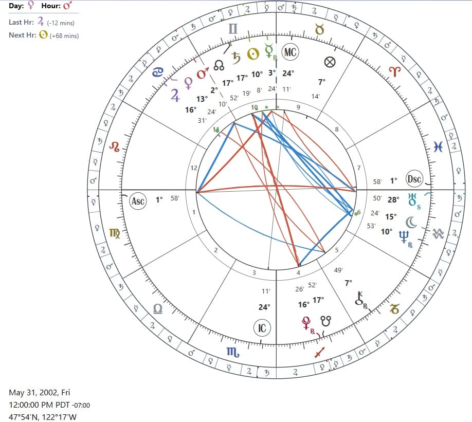 The plane was a Boeing 777-200ER, and it was delivered to Malaysia Airlines on May 31, 2002. Assuming 12 noon as the time of delivery, and assuming that Everett in Washington State (USA) must have been the place of delivery, this is the radix chart we get for the plane itself: