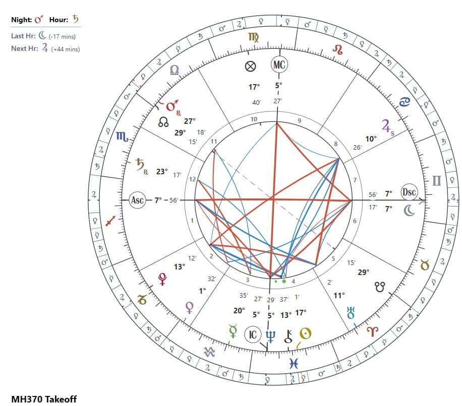 This is an extremely unfortunate takeoff time, with Neptune-Moon square right at the angles. The Moon is a natural significator here for the passengers on the plane, and Neptune is a malefic that signifies confusion, mystery and errors. (It also signifies travel crossing water.) Not only that, the 1st house ruler (i.e., the plane itself), Jupiter, is in the 8th house (loss and death) and stationary (thus, Jupiter hampered in its usual beneficence). In addition, if you remember, I have often noted that Jupiter plays a significant role in air accidents (I discussed this here in a piece on several Boeing plane accidents, and you will find the MH370 case there as well, discussed from Boeing's point of view). This Jupiter is also being squared by Uranus (from the aggressive sign of Aries) and opposed by Pluto, thus things become worse.