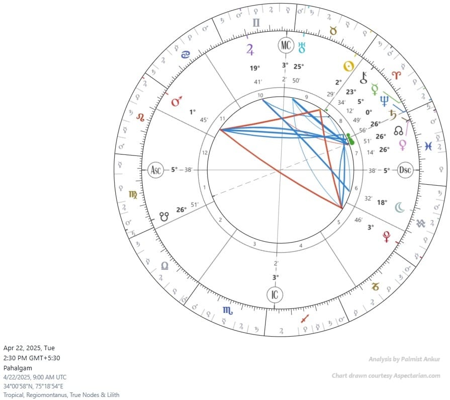 On April 22, 2025, at around 2:30 pm, in the idyllic surroundings of Pahalgam (Kashmir), a terror attack targeted tourists who had been enjoying the beauty of a an alpine meadow, located more than 2,000 metres above sea level. At least 26 people were killed, driving relations between India and Pakistan to a tense moment. Let us look at some of the astrological warnings that were always present for such type of an incident, then at the incident chart itself, and finally at what astrology shows to be the likely course of events in the next few months.