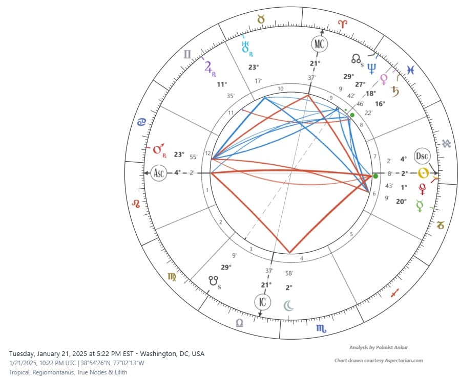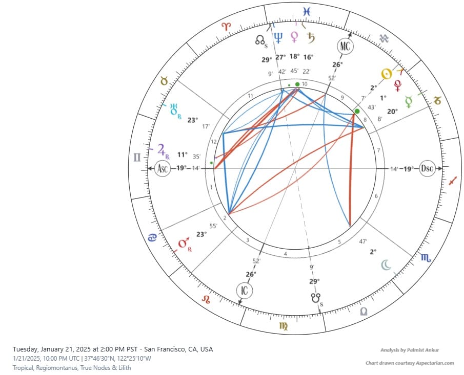 But what does the astrology indicate? Usually, when an announcement is made, the future can often be well indicated when one casts a chart for the time and date of the announcement. Now here I would rather go by the companies' press releases as primary factors and the Trump announcement as a secondary factor to take into consideration. I have not found any press release by Oracle on the subject, but there were press releases made by OpenAI and SoftBank Group. Both do not carry any time of release, but they seem to be issued, at least the OpenAI one, at 5 pm EST, that is, before Trump's announcement. OpenAI's headquarters is in San Francisco, California, so that means 5 pm ET is 2 pm PST for chart creation purpose (even if CEO Sam Altman was in DC at that time).