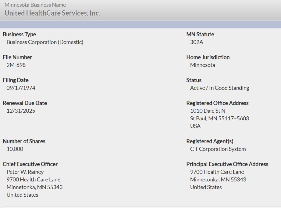 First, we need a "birth chart" for the firm. UnitedHealthCare was once upon a time Charter Med, Inc., and from the website of the Minnesota Secretary of State, I could obtain the following record regarding Charter Med's registry: